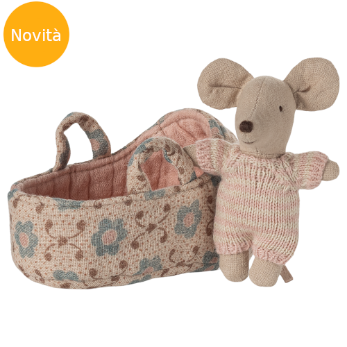 Questa grazioso topino, alto 8 cm, realizzato in cotone,  indossa una simpatica tutina a righe rosa e cipria lavorata a maglia. Ha una morbida culla portatile realizzata in un bel tessuto dove il piccolo topino può essere facilmente deposto per un pisolino. Buon divertimento!