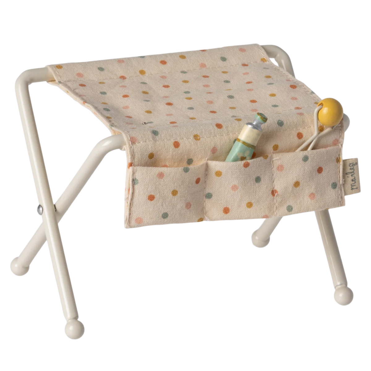 Il fasciatoio si adatta perfettamente a tutti i topi bebè. È dotato di pratiche tasche laterali in cui si trovano un piccolo sonaglio e un tubetto di crema per neonati, in modo che tutti gli accessori necessari siano facilmente raggiungibili.