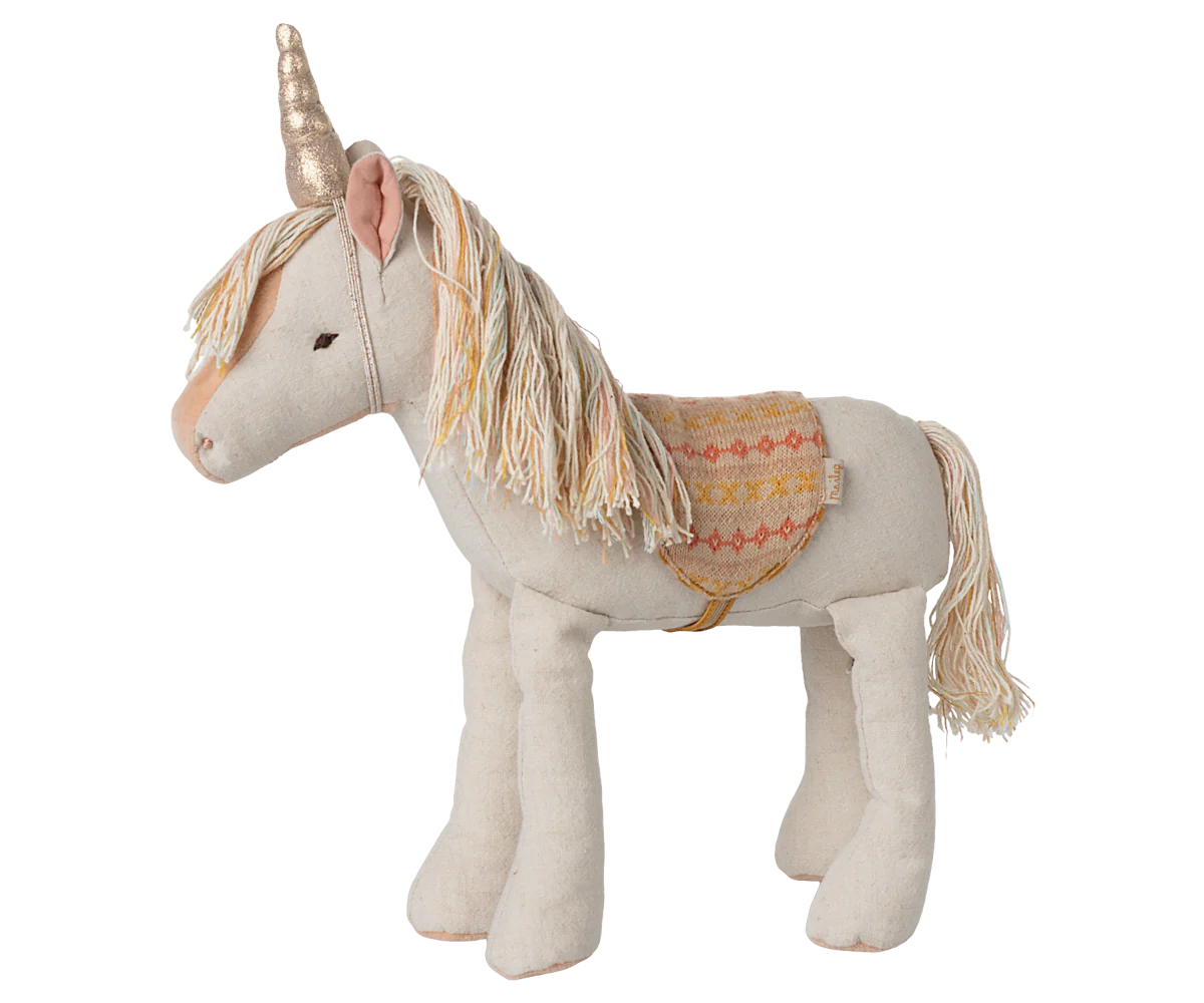 Gli unicorni sono creature fatate atte a esaudire i desideri dri bambni regalandogli bellissimi sogni. Il nostro bellissimo unicorno è realizzata in morbido tessuto di lino con tanto di corno dorato e sella decorata. Ha un aspetto adorabile col suo musetto dolce, e si adatta perfettamente alla stanza dei bambini. Un nuovo migliore amico per i più piccoli.